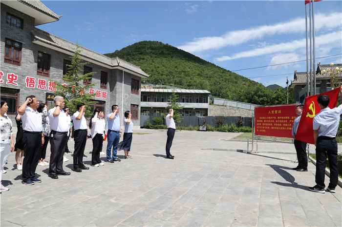 在纪兰党性教育基地前,后勤系统党委书记贺光明带领党员干部面对鲜艳的中国共产党党旗,重温入党誓词。铿锵有力的誓言震撼着所有人的心灵,表达着他们对党的无限忠诚。随后,全体党员共同唱响《没有共产党就没有新中国》,振奋人心的红色旋律在西沟村的上空久久飘荡。